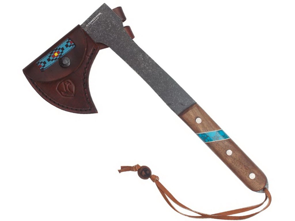 Die Tomahawk-förmige Axt von Condor TK wiegt nur 578 g, wodurch sie auch leicht im Wald oder Garten zu verwenden ist. Die Axt besteht aus Kohlenstoffstahl 1075 mit höherer Zähigkeit und eignet sich zum Hacken und für schwerere Arbeiten. Das Werkzeug hat ein klassisches Condor-Finish. Die Axt hat einen konvexen Schliff, typisch für höherwertige Hackwerkzeuge. Der Stiel besteht aus Walnussholz mitt einem türkisfarbenem Stein, an dessen Ende sich ein Loch zum Einfädeln der Kordel befindet. Die Axt wird mit einer braunen Lederscheide geliefert.
