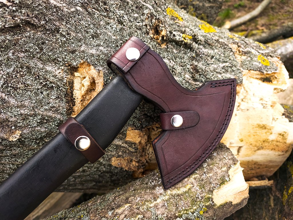 Die Lederhülle ist Teil des Pakets und ermöglicht Ihnen das bequeme Tragen der Axt auf jedem Outdoor-Ausflug im Wikinger-Stil .