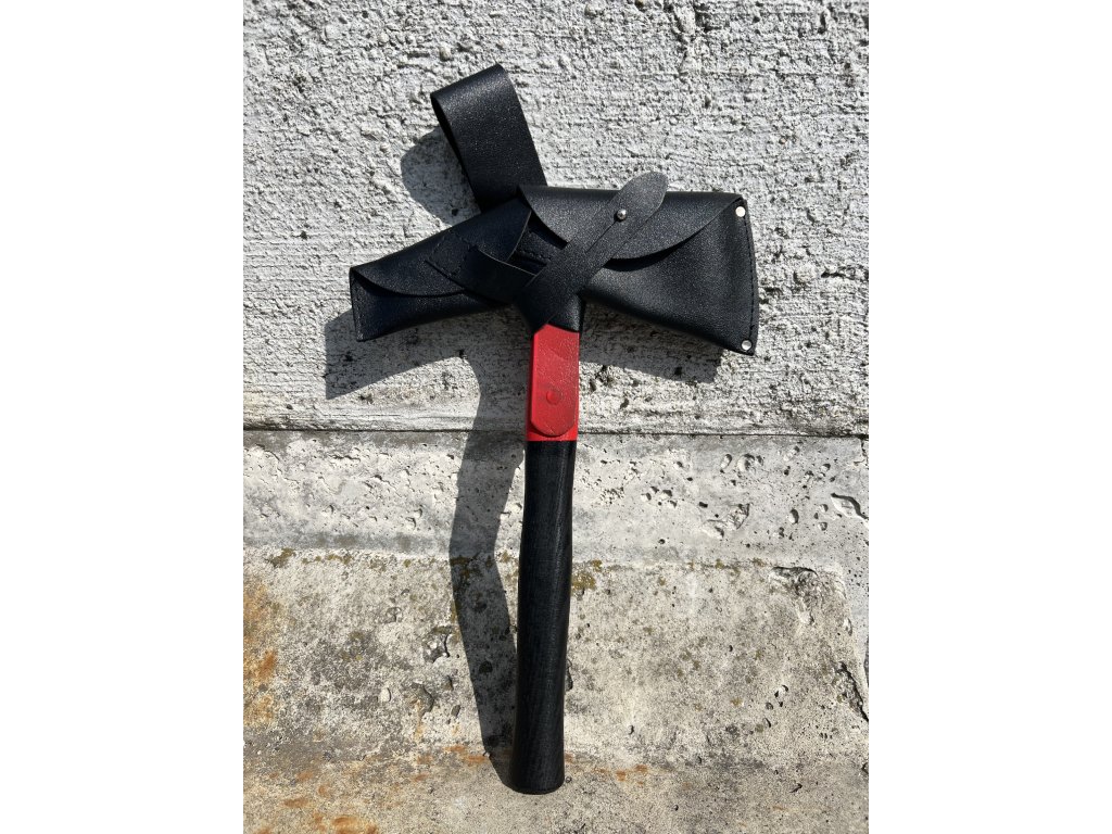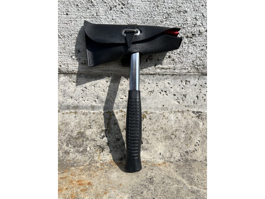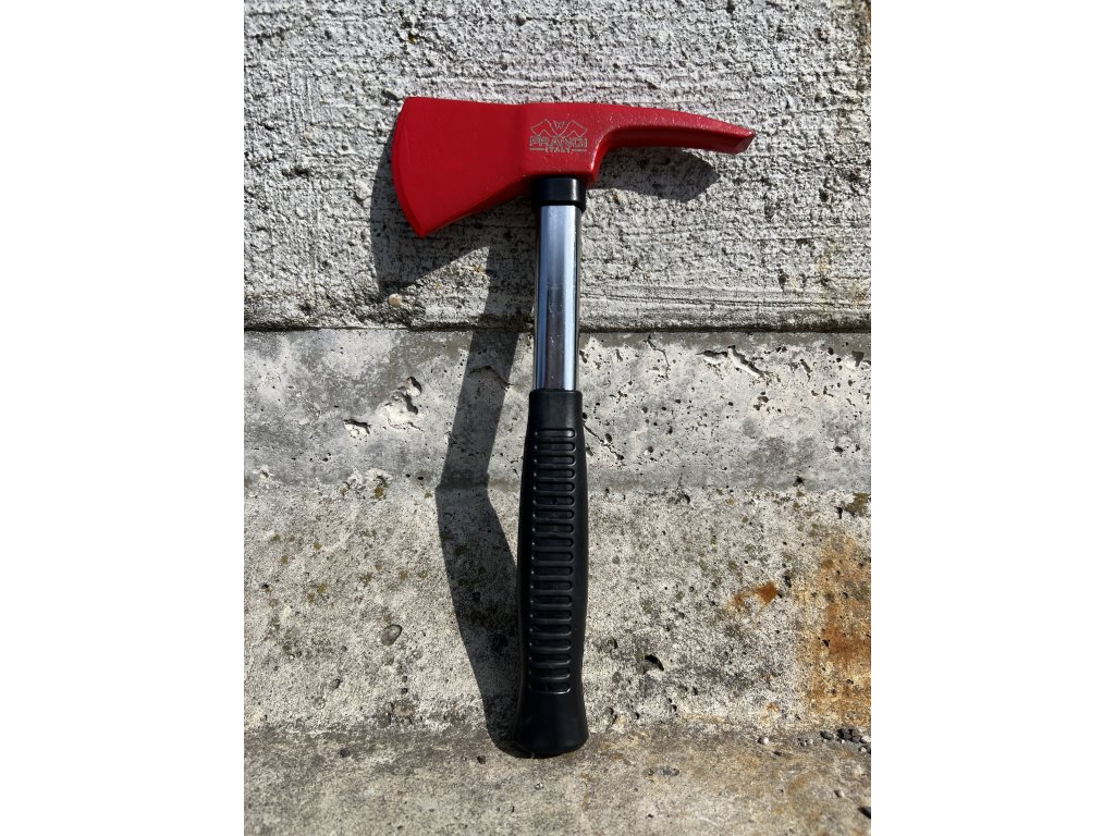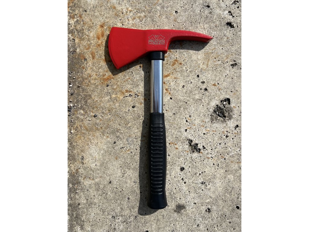 Handliche Feuerwehraxt DIN 14294, geeignet zum Aufhängen am Gürtel. Der Axtkopf besteht aus handgeschmiedetem C45-Kohlenstoffstahl und verfügt über eine solide Durchstechspitze. Der Axtstiel besteht aus Stahl mit Gummigriff. Das Gewicht des Axtkopfes beträgt 800 g. Die Länge des Stiels beträgt 32 cm. Eine schlichte Scheide aus Kunstleder ermöglicht es, die Axt am Gürtel aufzuhängen. Die Axt wird in Italien hergestellt.