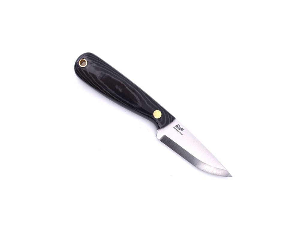 Der Griff aus schwarzem Micarta ist mit robusten Messingnieten befestigt und hat eine Länge von 9 cm. Am Griffende befindet sich eine Fangriemenöse (Lanyard Tube) zum Anbringen einer Kordel. Die Gesamtlänge des Messers beträgt 16 cm. Im Lieferumfang ist eine passende Kydex-Scheide enthalten.