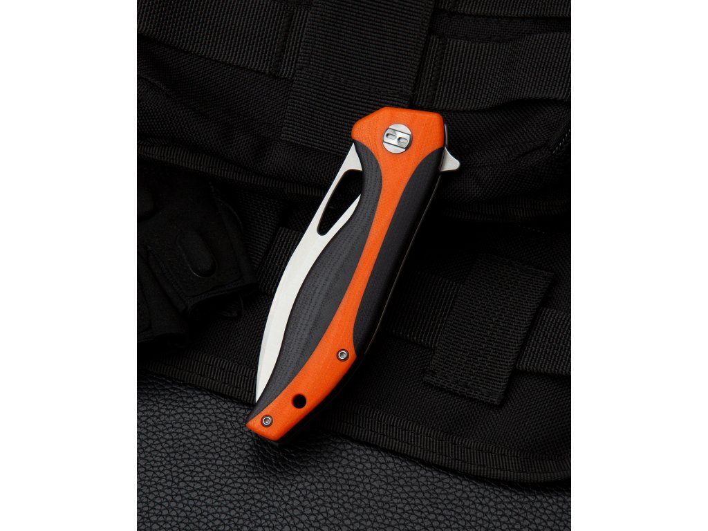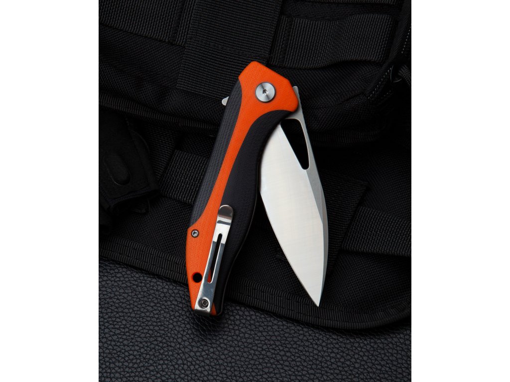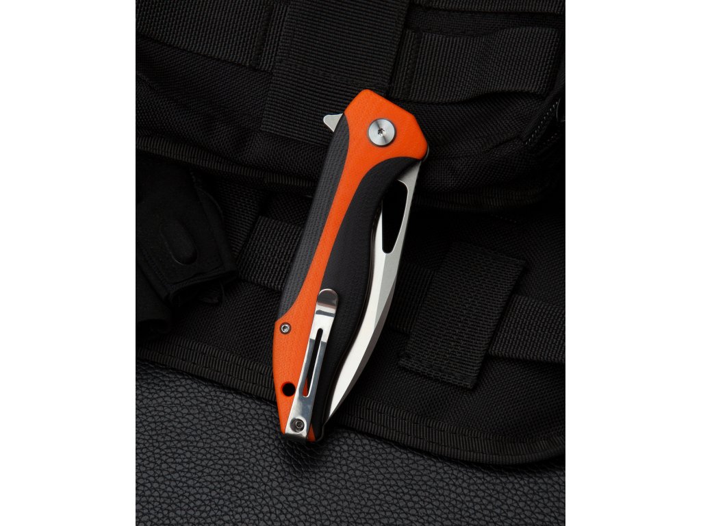 Bestech Komodo ist ein alltagstaugliches Klappmesser. Die flachgeschliffene Klinge aus D2-Werkzeugstahl ist 8,5 cm lang und auf Keramiklagern gelagert, was das Öffnen des Messers äußerst leicht und reibungslos macht. Schwarzer und orangefarbener G10-Griff. Das Messer ist mit einer Liner Lock-Verriegelung und einem Stahlclip zum Aufhängen ausgestattet. Wird per Flipper geöffnet.