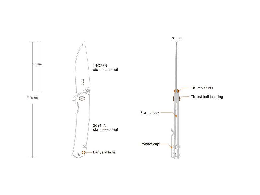 Ein Klappmesser mit elegantem Design für den täglichen Gebrauch. Die Klinge ist 3 mm dick und besteht aus kryogen behandeltem Sandvik 14C28N-Edelstahl, mit flachem Schnitt und einer Länge von 8,6 cm. Die Klinge ist mit einem Stonewash-Finish versehen und auf Kugellagern gelagert, was das Öffnen des Messers besonders erleichtert. Griff aus Edelstahl. Gesichert wird das Messer durch eine Frame Lock-Verriegelung. Clip zum Aufhängen des Messers. Einhändiges Öffnen mit einem Flipper.