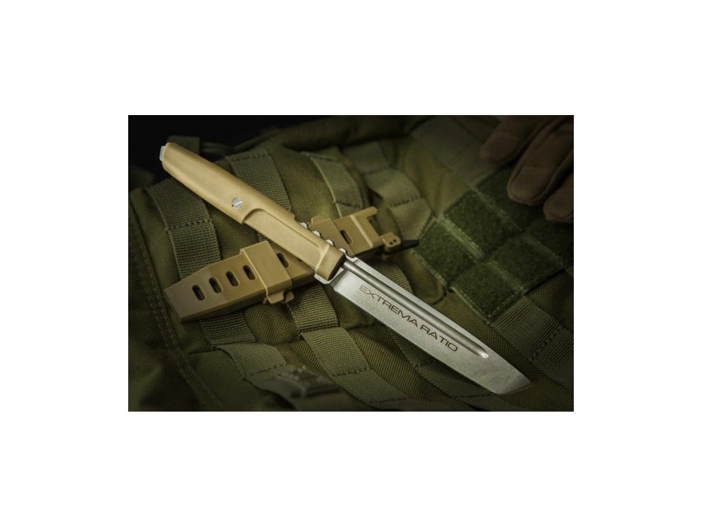 Das Messer ist mit der speziellen Aspis-Nylonscheide ausgestattet, die von Extrema Ratio entwickelt wurde. Die Scheide ermöglicht ein extrem schnelles Ziehen der Klinge und ist mit dem Molle-System kompatibel.