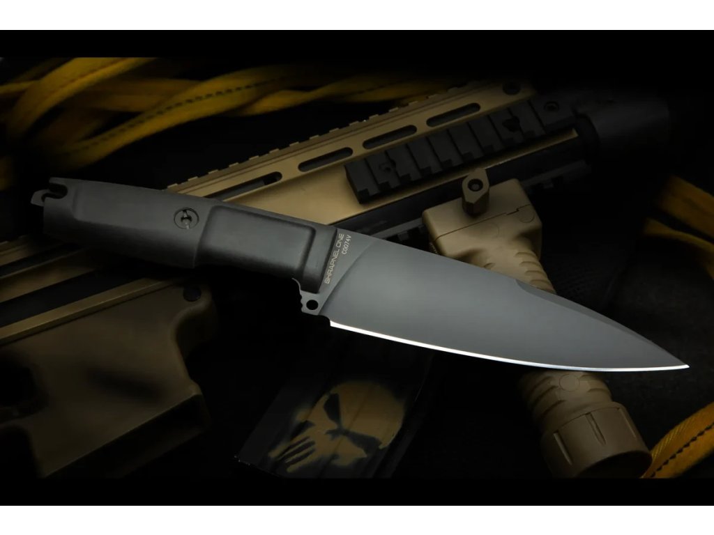 Die 15,7 cm lange Klinge aus Böhler N690-Stahl wurde poliert und mit einer MIL-C-13924-Schicht (schwarzes Oxid) chemisch beschichtet, um Beständigkeit und Schutz gegen Oxidation zu gewährleisten. Die Härte des Stahls beträgt 58 HRC und er verfügt über einen Flachschliff.