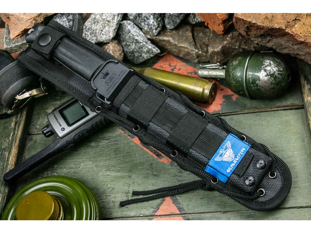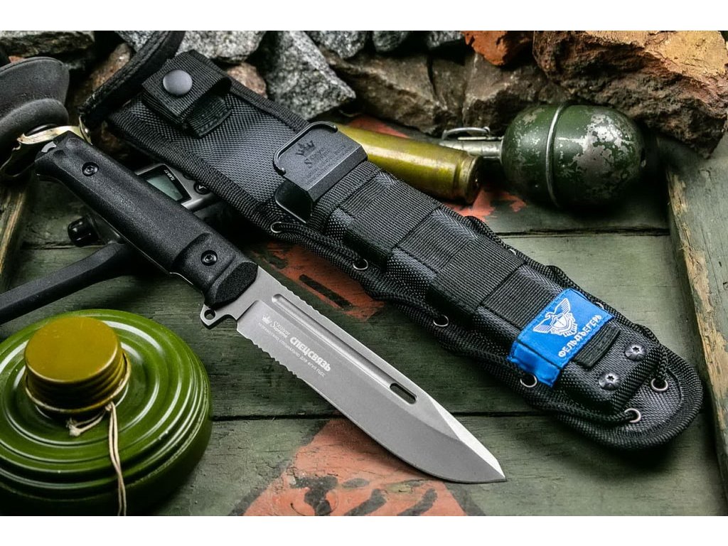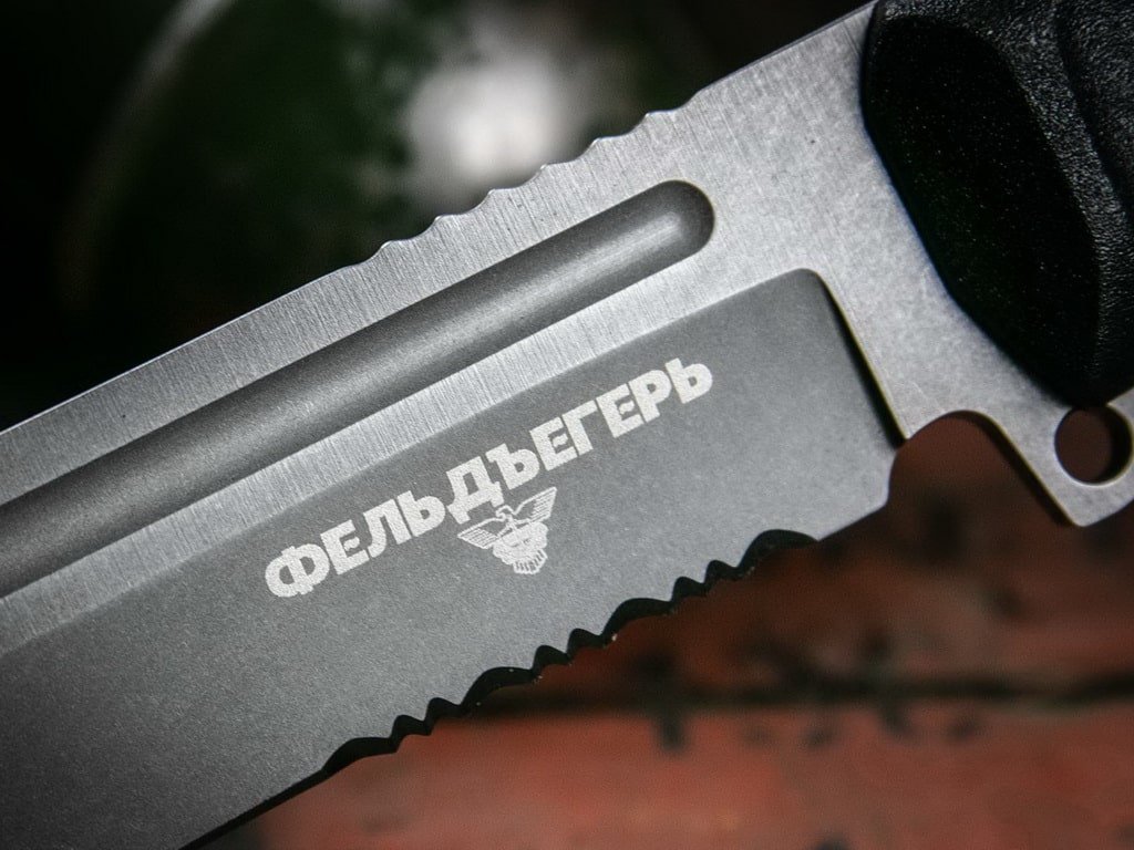 Kizlyar Supreme Feldjaeger ist ein Kampfmesser. Full-Tang-Konstruktion, die seine Stärke und Zuverlässigkeit gewährleistet. Klinge aus AUS-8-Stahl, Härte 57-59 HRC, mit TacWash-Oberflächenbehandlung und Teilverzahnung. Der Griff besteht aus zwei Schichten – die untere Schicht besteht aus ABS-Kunststoff, was die Festigkeit des Griffs gewährleistet. Die obere Schicht des Griffs besteht aus Kraton, das sich angenehm anfühlt und gleichzeitig sehr langlebig ist. Das Messer wird mit einer Nylon-Kunststoffscheide geliefert, die mit dem Molle-System kompatibel ist.
