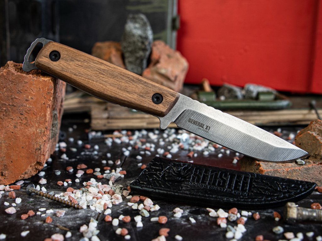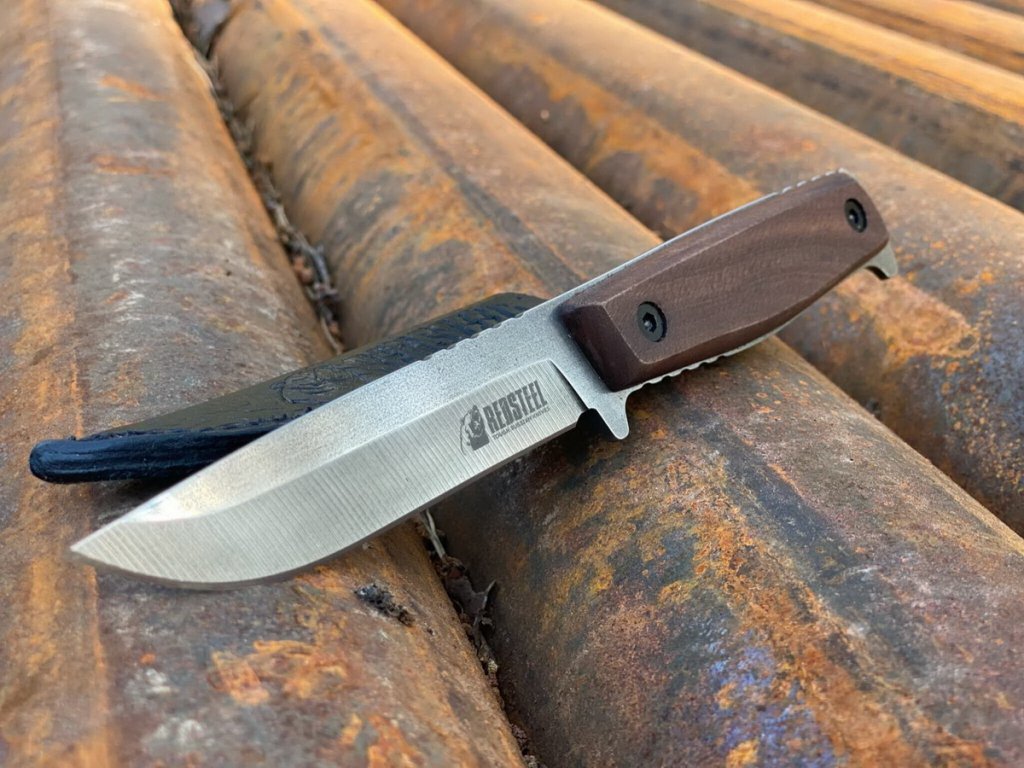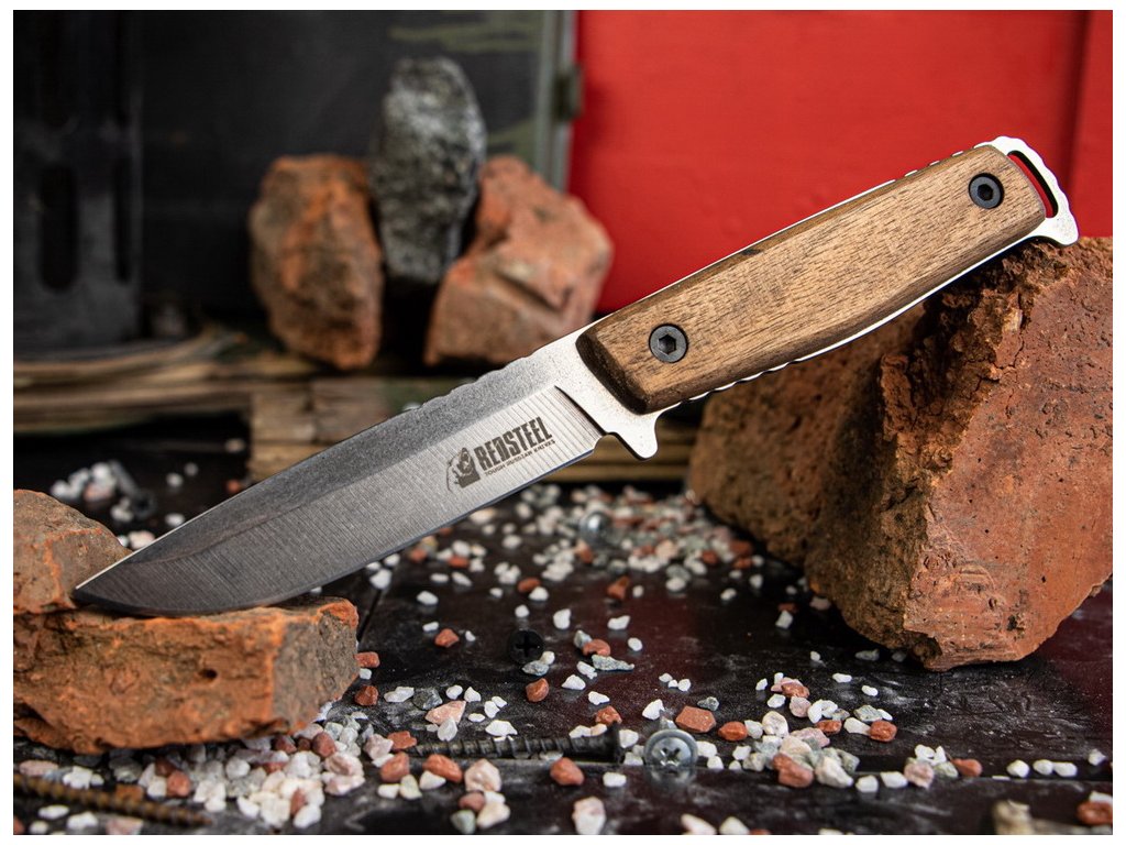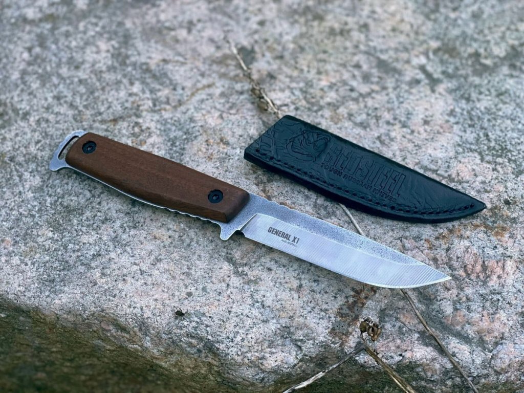 RedSteel General X1 ist ein einfaches Arbeits- und Jagdmesser aus hochwertigen Materialien. Klinge aus Edelstahl AUS-8, Härte 58 - 59 HRC. AUS-8-Stahl erfordert keine besondere Pflege, ist leicht zu schärfen und splitterfest. Mit einer Klingenlänge von 10,9 cm eignet sich das Messer hervorragend zum Wandern, für einfache Arbeiten rund ums Haus und im Garten. Auch als einfaches Jagdmesser ist es sehr gut verwendbar. Die Klingenstärke von 2,7 mm verleiht dem Messer ausreichend Festigkeit und verleiht ihm gleichzeitig in Kombination mit einem Hohlschliff hervorragende Schneideigenschaften.
