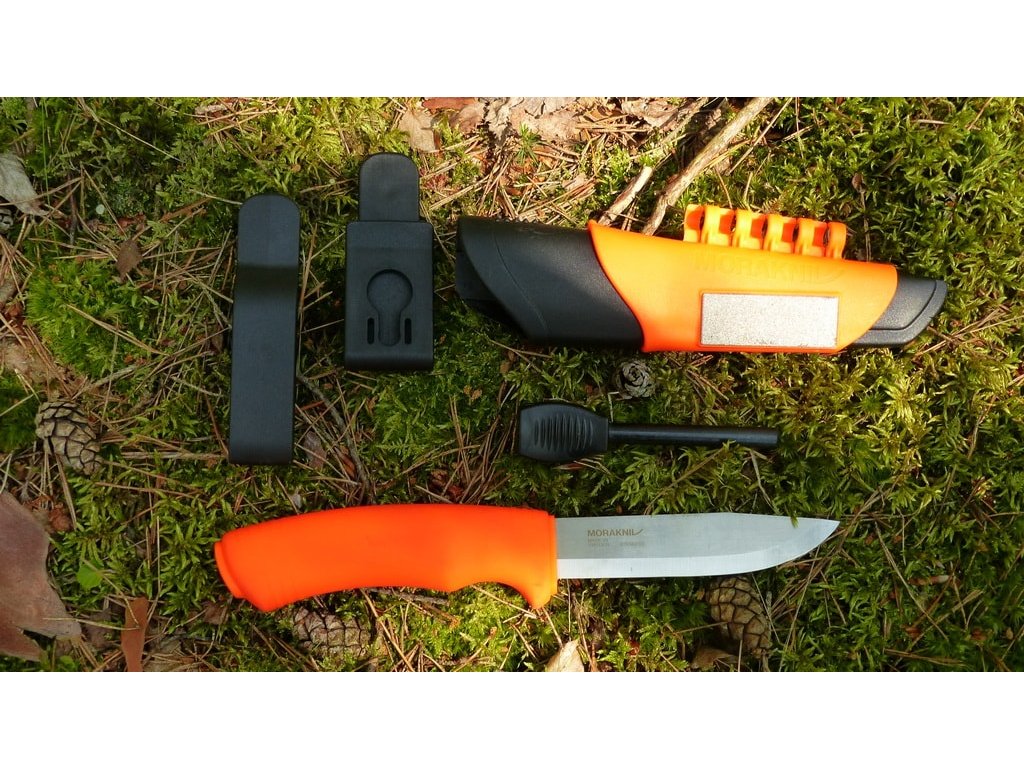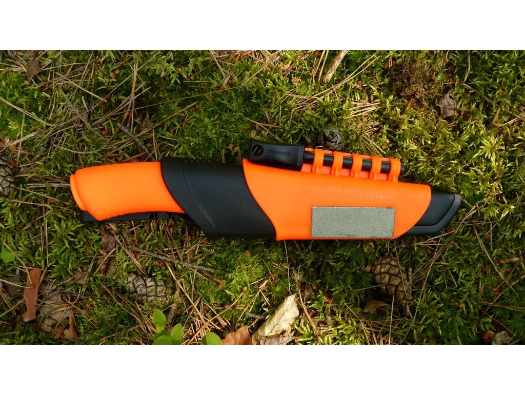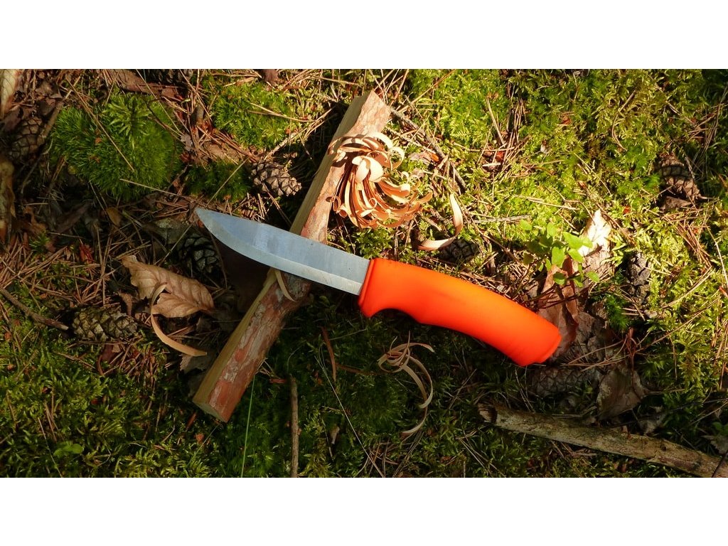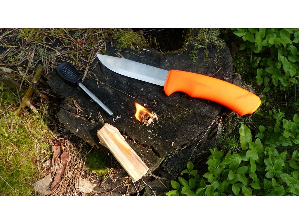 Messer der Bushcraft-Serie sind für ihre hervorragende Ergonomie und Praktikabilität bekannt. Der rostfreie Sandvik-Stahl 12C27 mit einer Klingenstärke von 3,2 mm zeichnet sich durch hervorragende Korrosionsbeständigkeit und gleichzeitig hohe Verschleißfestigkeit aus. Der ergonomisch geformte Kunststoffgriff mit Gummi liegt gut in der Hand und rutscht auch bei nasser Hand nicht ab. Das Messer wird mit einem orangefarbenen Kunststoffkoffer geliefert, der eine Schleiffläche (Diamant), einen Gürtelclip und einen Feuerstein zum Anzünden des Feuers enthält.