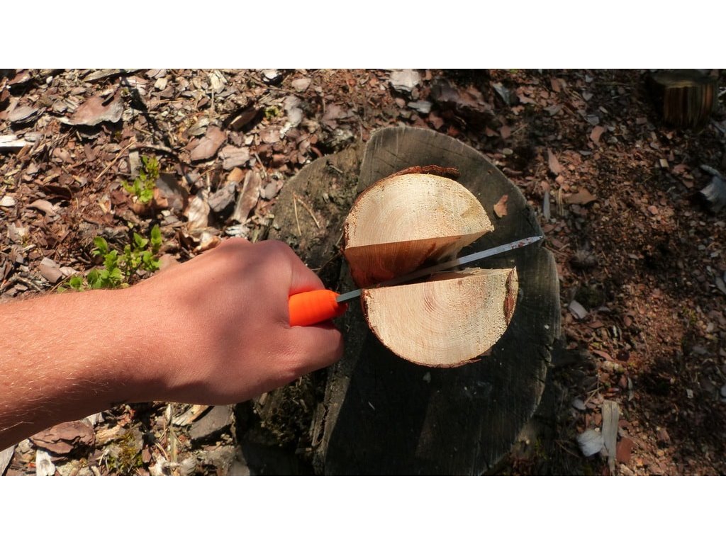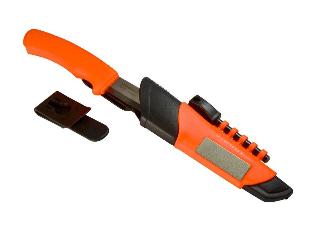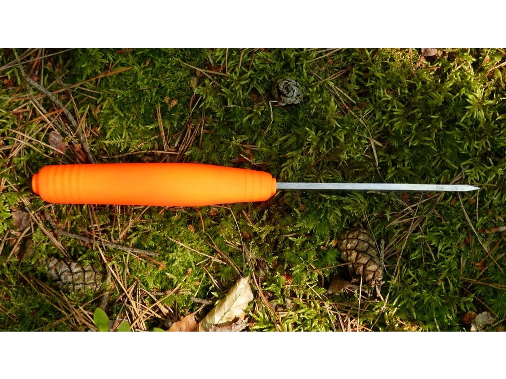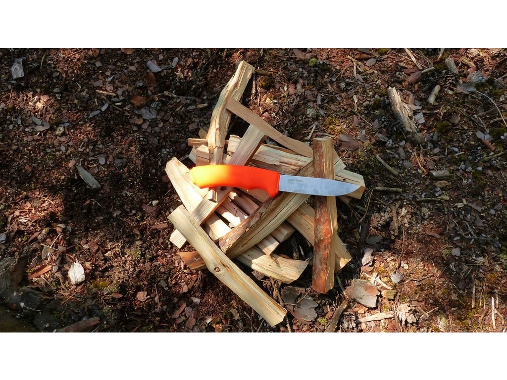 Messer der Bushcraft-Serie sind für ihre hervorragende Ergonomie und Praktikabilität bekannt. Der rostfreie Sandvik-Stahl 12C27 mit einer Klingenstärke von 3,2 mm zeichnet sich durch hervorragende Korrosionsbeständigkeit und gleichzeitig hohe Verschleißfestigkeit aus. Der ergonomisch geformte Kunststoffgriff mit Gummi liegt gut in der Hand und rutscht auch bei nasser Hand nicht ab. Das Messer wird mit einem orangefarbenen Kunststoffkoffer geliefert, der eine Schleiffläche (Diamant), einen Gürtelclip und einen Feuerstein zum Anzünden des Feuers enthält.