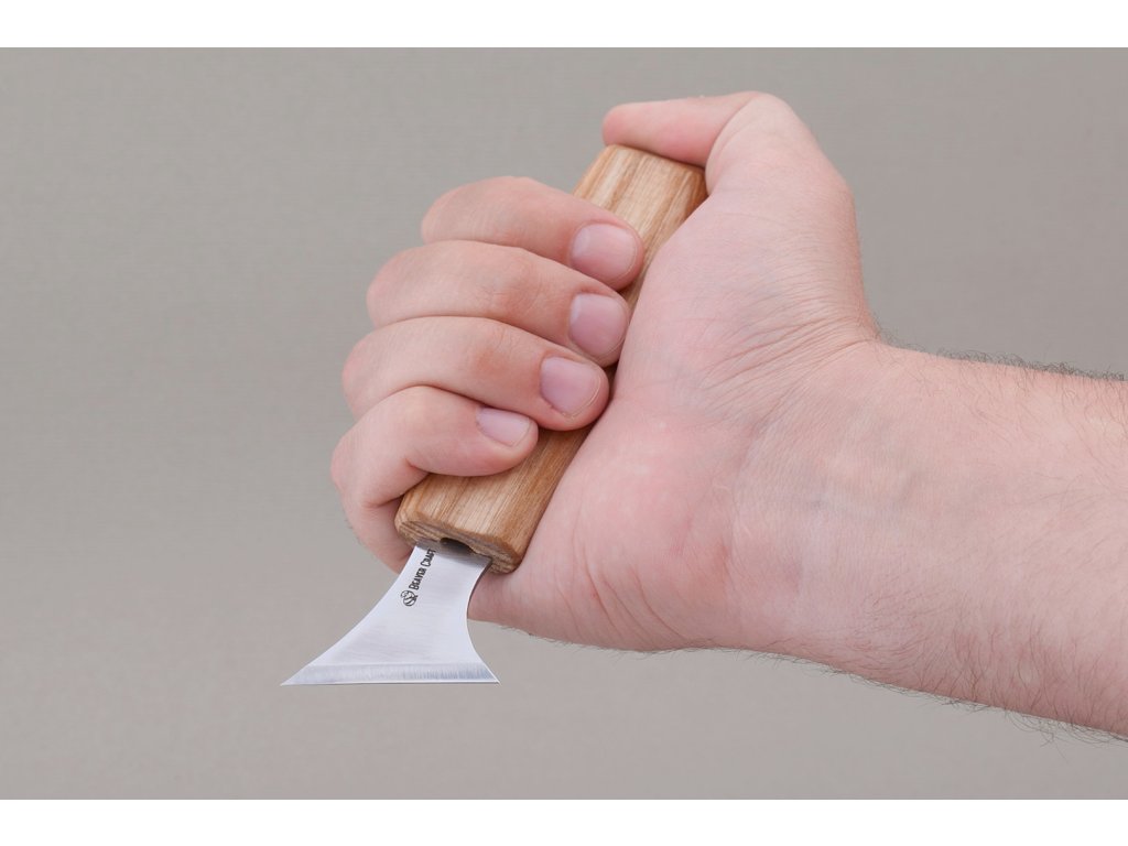Spezielles Schnitzmesser, geeignet zum Schnitzen geometrischer Formen. Die Länge der Schneide beträgt 4 cm. Gehärtet auf 57 - 59 HRC. Die Klinge aus 65G-Kohlenstoffstahl hat eine gute Schnitthaltigkeit und ist leicht zu schärfen, allerdings ist sie anfälliger für Rost (das Messer muss nach Gebrauch gründlich gereinigt und getrocknet werden, außerdem empfiehlt es sich, die Klinge von Zeit zu Zeit mit Öl einzureiben). Der Griff des Messers besteht aus Eschenholz, imprägniert mit Leinöl.