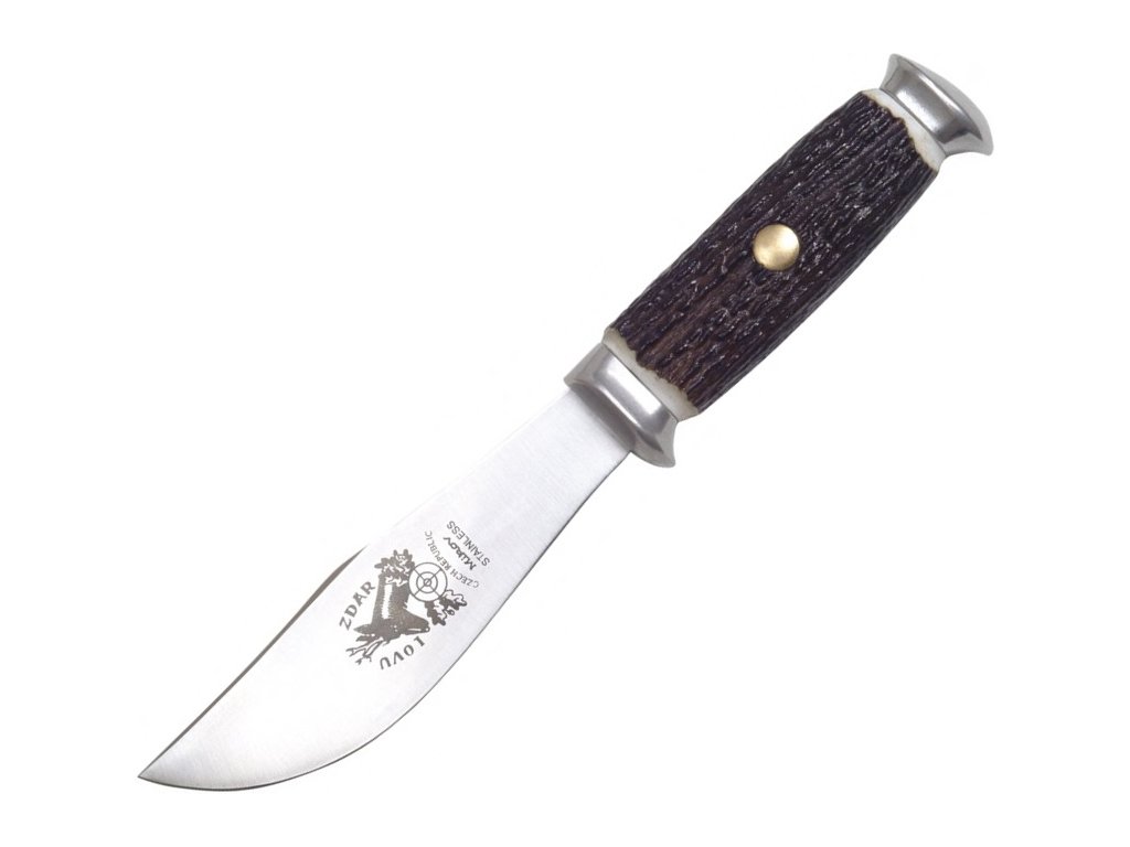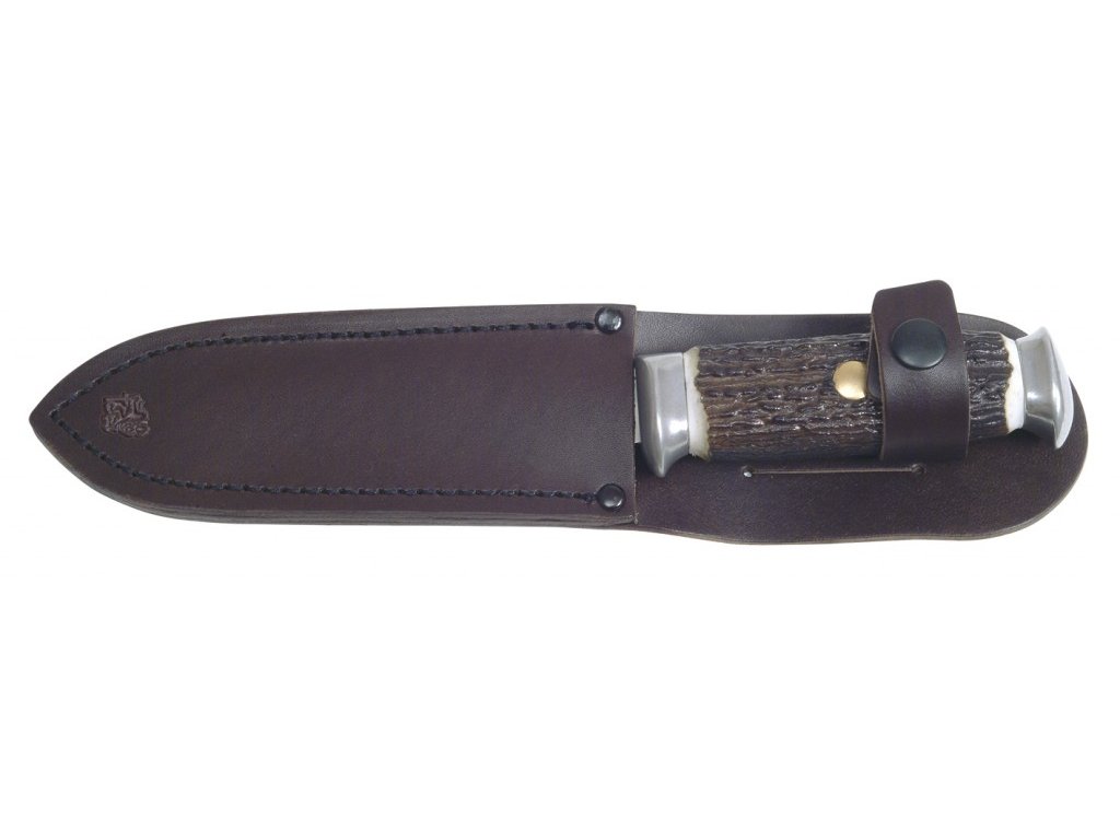 Ein Jagdmesser mit einer sehr breiten Klinge (35 mm) und einem markanten Bogen, der vor allem von Jägern beim Hauten geschätzt wird. Der Griff ist aus Imitation von Horn gefertigt und bietet einen bequemen Griff sowie leichte Pflege. Das Messer wird zusammen mit einer Lederscheide geliefert.