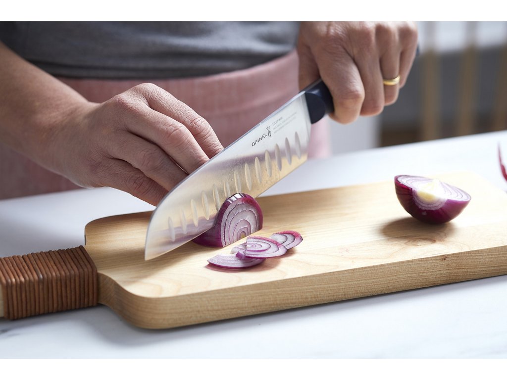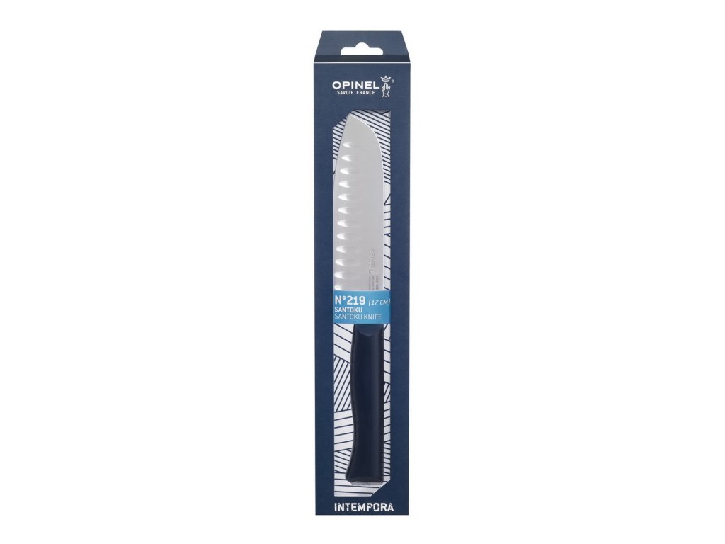 Küchenmesser der französischen Marke Opinel aus der Intempora-Serie. Die 17 cm lange Santokuklinge ist ideal zum Hacken und Schneiden. Die Klinge besteht aus rostfreiem Sandvik 12C27-Stahl. Die Full-Tang-Konstruktion des Messers garantiert hohe Festigkeit, Robustheit und eine ausgewogene Balance. Der Griff besteht aus thermoplastischem Polymer (POM), das eine hohe Beständigkeit gegen Verschleiß, Wasser und Stöße aufweits. Ein Schutz am Ende des Griffs schützt Ihre Hand vor dem Abrutschen und erhöht die Sicherheit beim Arbeiten mit dem Messer.
