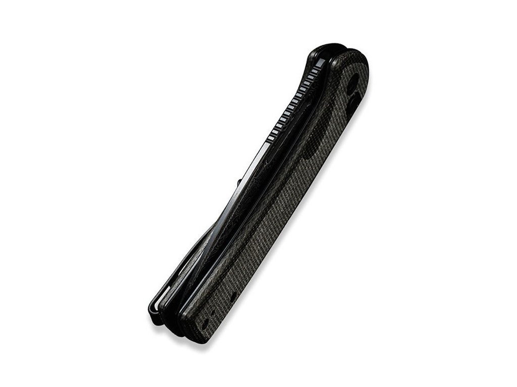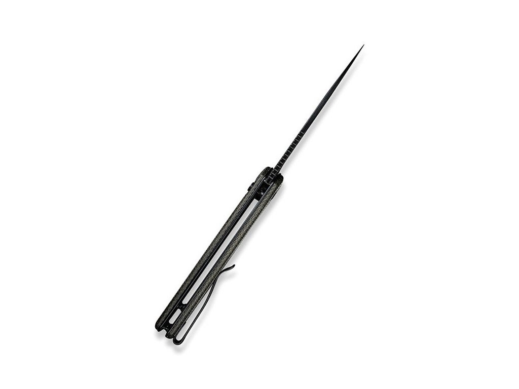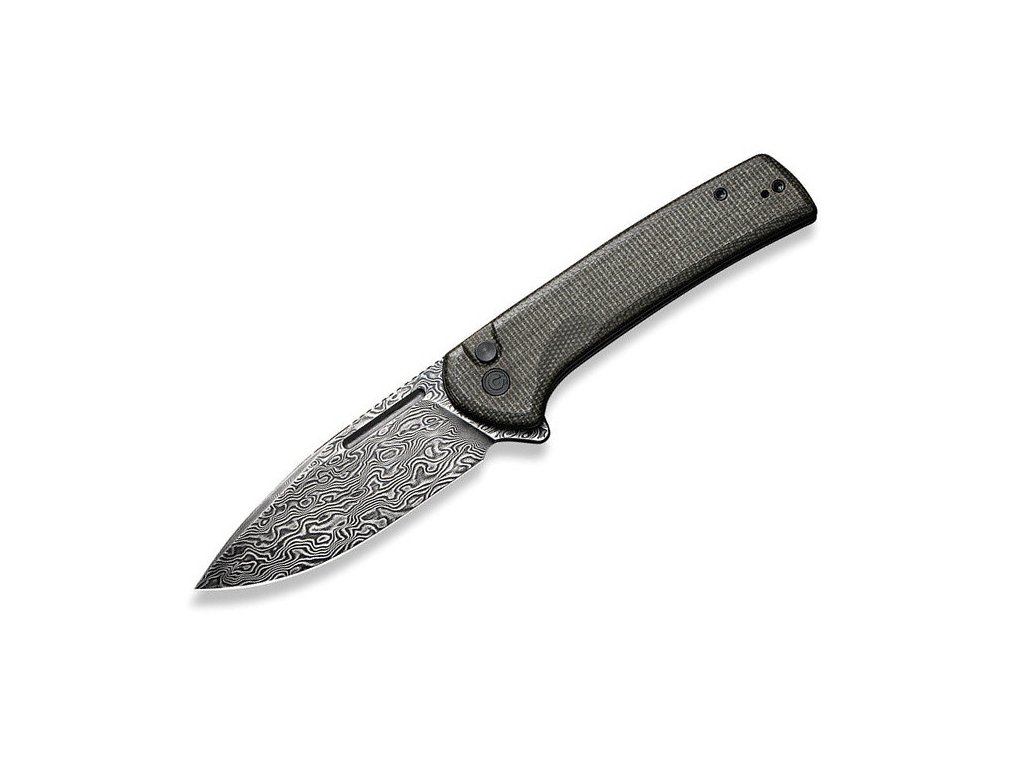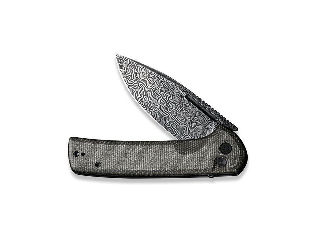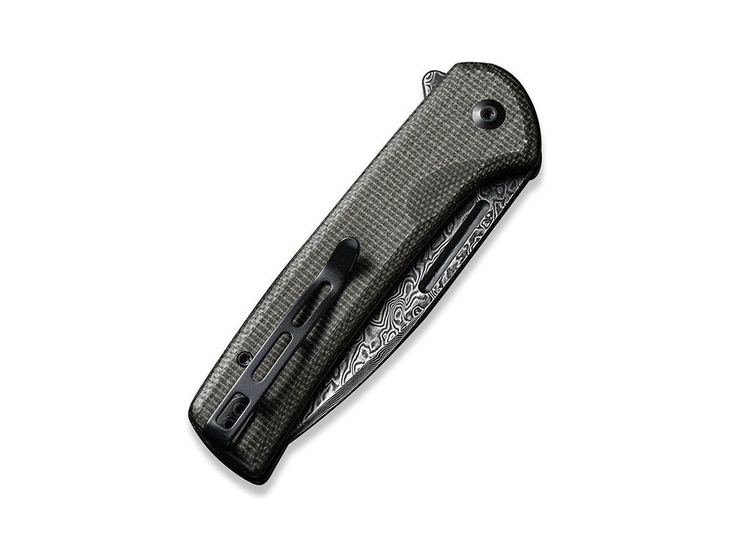 Civivi Conspirator ist ein mittelgroßes Klappmesser. Klinge aus Drop-Point-Damaststahl mit flachem Schnitt. Griff aus dunkelgrünem (fast grauen) Micarta mit hervorragender Griffigkeit. Sicherungsknopf. Der Messeraufhängeclip aus Edelstahl ist beidseitig umkehrbar (rechts/links). Einhändiges Öffnen mit Flipper. Das Öffnen des Messers ist sehr einfach und reibungslos, die Klinge ist auf Keramiklagern gelagert.
