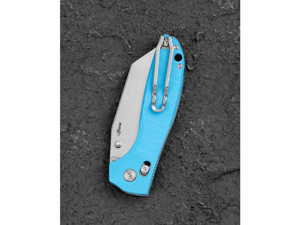Der Griff aus hellblauem G10 ist für einen sichereren Halt texturiert, die Grifflänge beträgt 12,16 cm. Die Einhandbedienung erfolgt über den Daumenpin (Thumb Stud) an der Klinge, während ein Bar Lock (Axis) die Klinge im geöffneten Zustand sicher arretiert. Am Griff befindet sich eine Fangriemenöse (Lanyard Hole). Das Messer verfügt zudem über einen Deep-Carry-Pocketclip (Tip-Up), der sowohl für Rechts- als auch für Linkshänder geeignet ist. Gesamtlänge 21,32 cm. Das Gewicht des Messers beträgt 130 g. Das Design stammt von Keanu Alfaro.