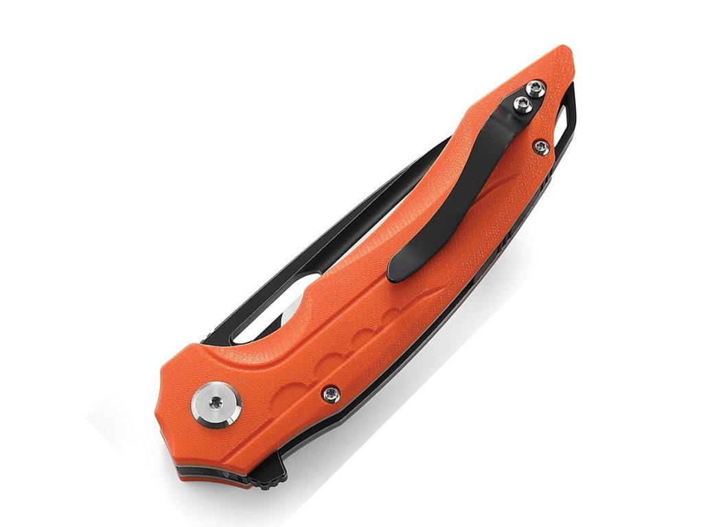 Bestech Ornetta ist ein faltbares EDC-Messer mit einzigartigem Design, entworfen von Grzegorz Grabarski, bekannt als Kombou. Es handelt sich um eine Liner Lock-Konstruktion mit einer auf Keramiklagern gelagerten Klinge. Das Messer wird per Flipper geöffnet. Die 9 cm lange Drop-Point-Klinge mit mattem Finish besteht aus D2-Werkzeugstahl. Die Klinge ist flach geschliffen und auf Keramiklagern gelagert, was das Öffnen des Messers äußerst leicht und reibungslos macht. Der Griff besteht aus G10 in der Farbe Orange.
