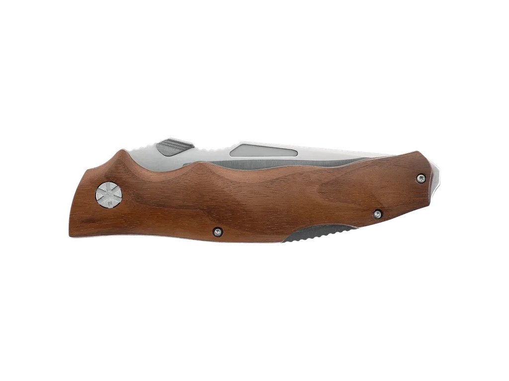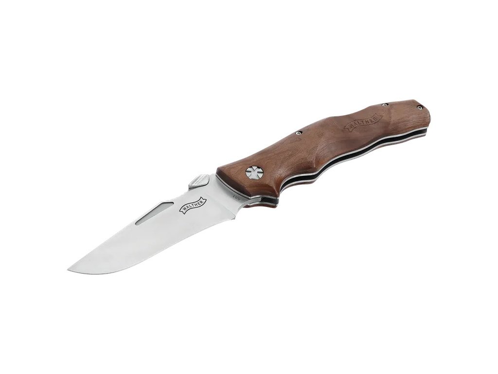 Ein massives Klappmesser für die Natur, auch als klappbares Jagdmesser geeignet. Das Walther AFW-Messer erledigt problemlos Aufgaben, die kleinere Klappmesser nicht bewältigen können. Die Klinge aus japanischem Edelstahl AUS-8 mit Hohlschliff ist 10,2 cm lang. Mithilfe der Ausbuchtung auf der Rückseite der Klinge lässt es sich leicht mit einer Hand öffnen. Der Griff aus Walnussholz ist angenehm anzufassen und ergonomisch geformt. Das Messer hält sehr gut und macht einen eleganten Eindruck. Das Messer ist mit einer Rückenverriegelung ausgestattet, die stark und zuverlässig ist. Im Lieferumfang ist eine Lederhülle enthalten, das Sie an den Gürtel hängen können.