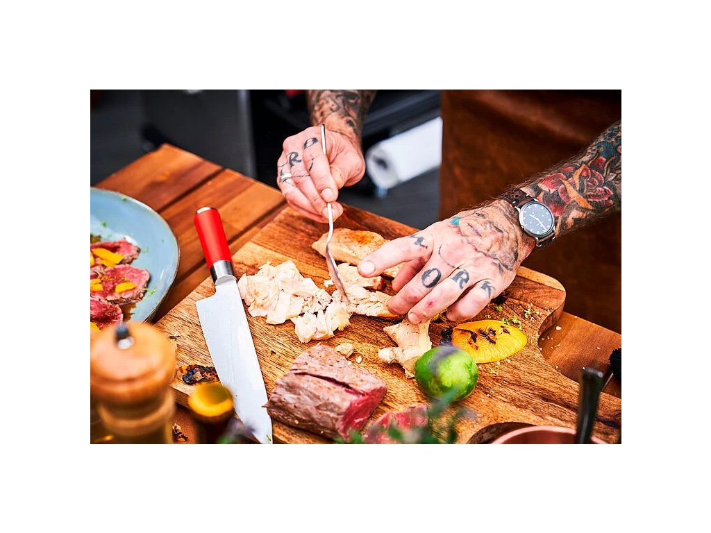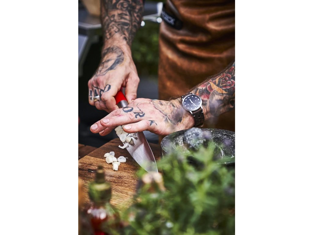 Das Chefkoch Küchenmesser ist ein mittelgroßes Messer mit einer Klingenlänge von 21 cm und hat vielseitige Anwendungen in der Küche, ideal für die Verarbeitung von Gemüse und Fleisch. Die Klinge des Messers ist aus hochlegiertem, rostfreiem deutschen X55CrMo14 Stahl gefertigt, der aufgrund seiner Eigenschaften bei der Herstellung von Küchenmessern sehr beliebt ist. Der Griff des Messers besteht aus hochwertigem Kunststoff in der Farbe Rot und hat eine ovale Form. Das Material ist rutschfest, und die Griffgestaltung gewährleistet eine ergonomische und sichere Handhabung. Auch dieser Teil des Messers wurde entwickelt, um den hohen Anforderungen professioneller Köche gerecht zu werden und gleichzeitig ambitionierte Hobbyköche zu unterstützen.