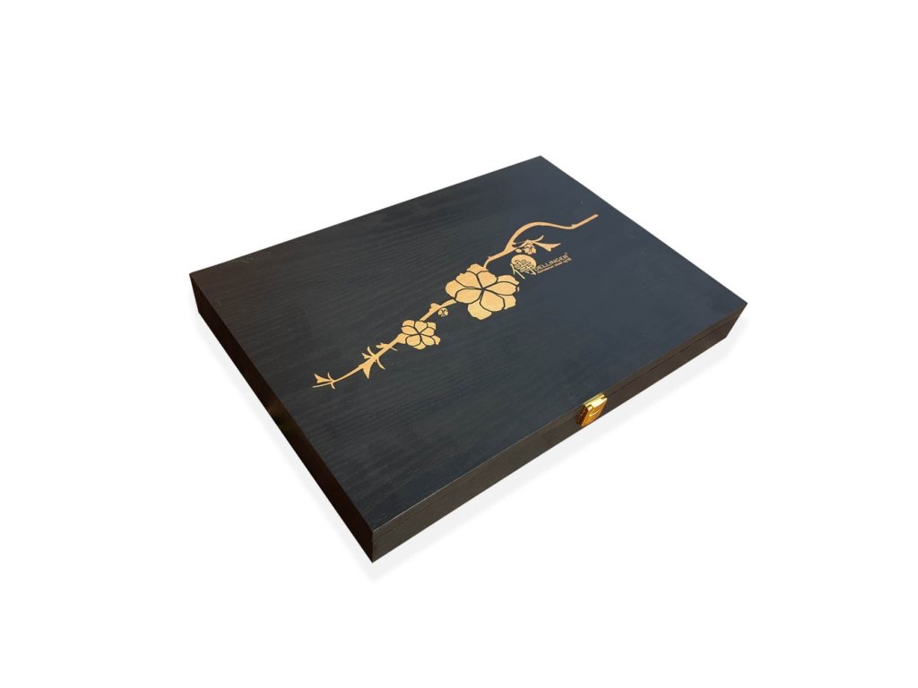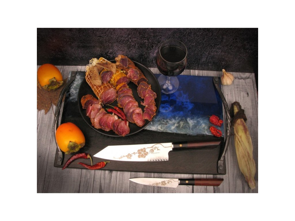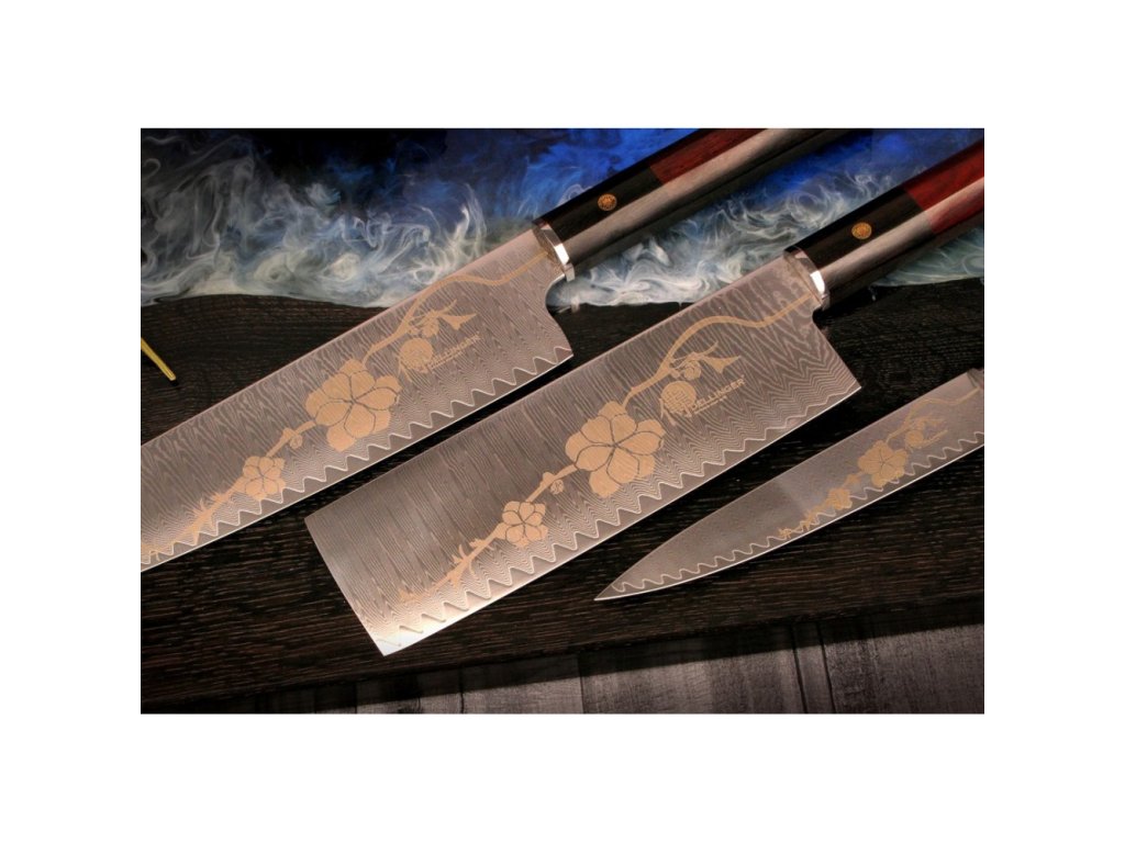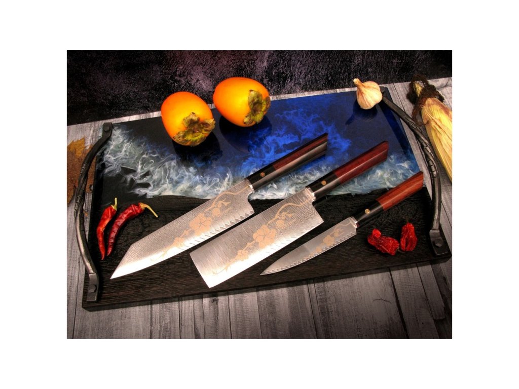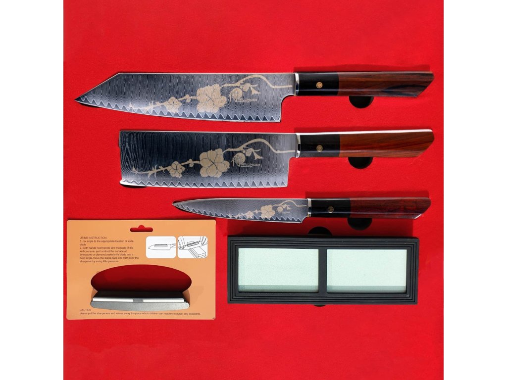 Luxuriöses Set von 3 Messern aus japanischem Damaststahl mit einem beeindruckenden Kirschblütenmotiv direkt auf der Klinge. Die verwendete Schneidlage besteht aus VG-10 Stahl, der sehr korrossionsbeständig ist und zwischen 66 Schichten zwei Damaststähle SS316 eingebettet ist. Der Stahl selbst stammt aus Japan und zeichnet sich durch seine außergewöhnliche Schärfe und Härte von etwa 61 HRC aus. Die extreme Klingenhärte wird durch das präzise Tempern in vakuumierten Öfen erreicht. Das Set enthält außerdem einen Schleifstein mit einer Körnung von 1000/6000 und eine Führungshilfe für höheres Schärfen. Die schlichte Verzierung mit einem zentralen Mosaikstift verleiht den Messern ein elegantes Aussehen. Die Griffe des Küchenmessers sind ergonomisch geformt für einen zuordnenden Griff. Das Gesamtbild der Messer wird durch das beeindruckende Motiv geschaffen, das an den schönsten Kirschblüten Japans entsteht. Dieses Messerset eignet sich perfekt als Geschenk für jeden, der gerne Zeit in der Küche verbringt und das Schneiden nicht nur als Pflicht ansieht.