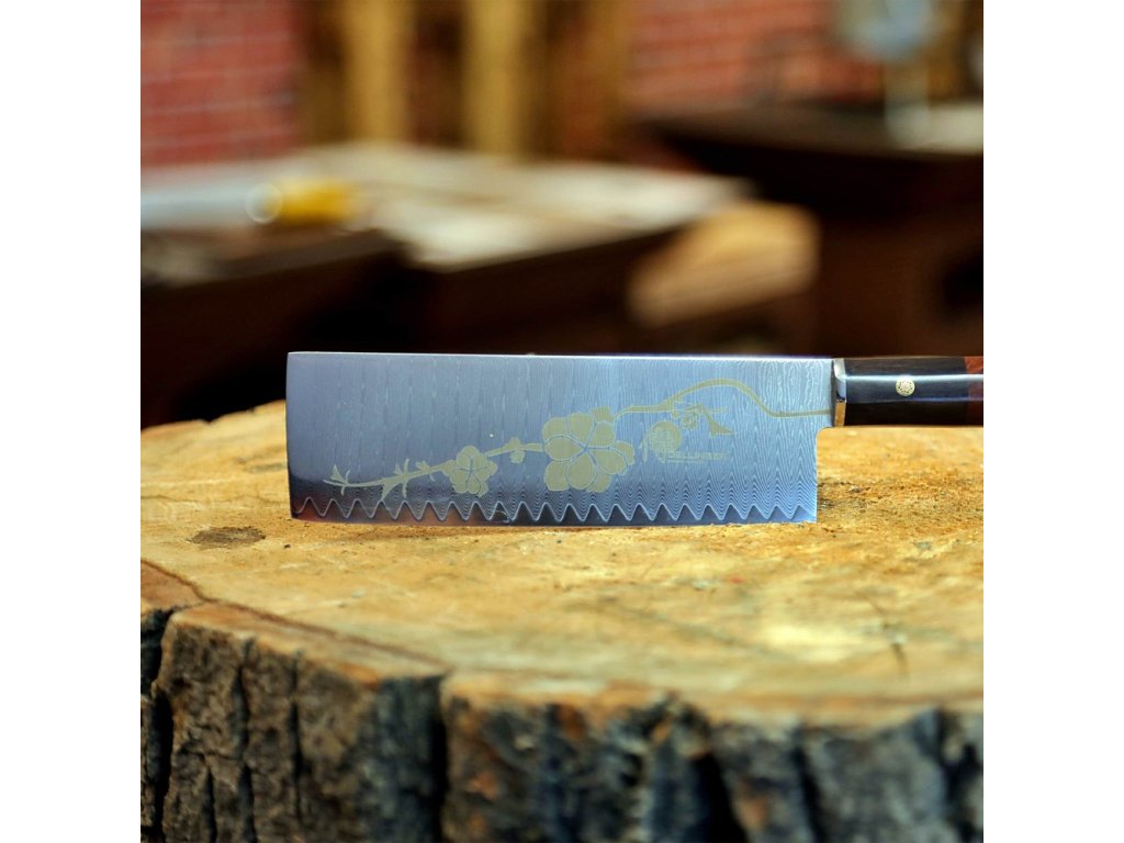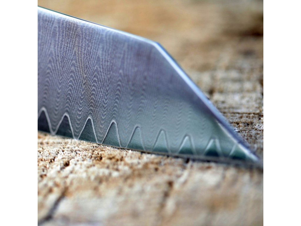 Wartung und Reinigung: Jedes Messer verdient besondere Aufmerksamkeit. Messer aus Damaststahl sollten niemals in der Spülmaschine gereinigt werden. Waschen Sie sie nur von Hand und trocknen Sie sie sofort ab. Vergessen Sie nicht, gelegentlich etwas Öl aufzutragen. Bei Kontakt des Messers mit aggressiven Elementen könnte sich Korrosion auf der Klinge bilden. Durch die Pflege des Messers vermeiden Sie auch Flecken auf der Oberfläche, die in Form von kleinen Kerben auften könnten. Dieser Stahl ist nicht rostfrei. Verwenden Sie Messer aus japanischem Stahl auf keinen Fall zum Schneiden von harten und gefrorenen Lebensmitteln. Dies könnte zum Bruch des Messers oder zum Abbrechen eines Teils führen.