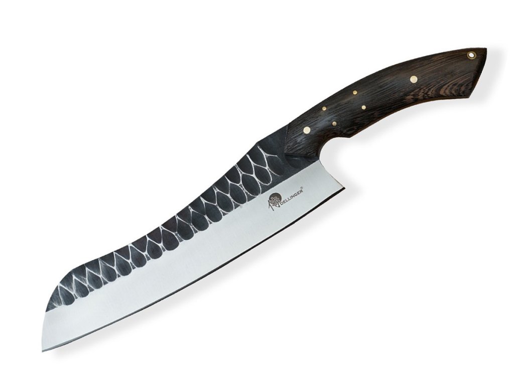 Handgeschmiedetes Dellinger Messer aus exotischem Wengeholz und verarbeitet aus D2-Stahl. Ein Küchenmesser, das Sie nicht überraschen wird – egal ob Sie Gemüse, Gebäck oder Fleisch schneiden. Wenn Sie beim Schneiden und Hacken Ihrer Leckereien ein völlig neues Erlebnis erleben möchten, kommen Sie an diesem Werkzeug nicht vorbei. Erweitern Sie Ihre Küchensammlung mit diesem einzigartigen Stück oder nehmen Sie es einfach mit nach draußen zum Grillen mit Freunden.