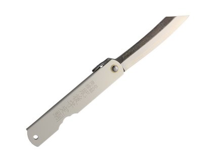 Traditionelles japanisches Higonokami-Klappmesser mit einer 7,5 cm langen Klinge und einem mattsilbernen Eisengriff. Die Klinge besteht aus Schichtstahl, der nach der...