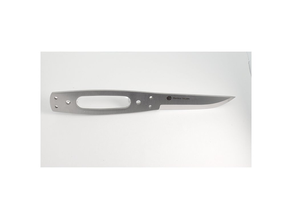 Messerklinge zur Herstellung eines 3,7 mm dicken Messers aus Sandvik 14C28N Edelstahl. Die Klinge hat ein Full-Tang-Design. Die Gesamtlänge beträgt 20,3 cm, die Länge der Klinge selbst beträgt 9,3 cm. Die Breite der Klinge beträgt 2 cm, die Durchmesser der Löcher im Griff betragen 2 x 4,7 mm und 4 x 3,1 mm. Die Klinge hat einen skandinavischen Schliff.