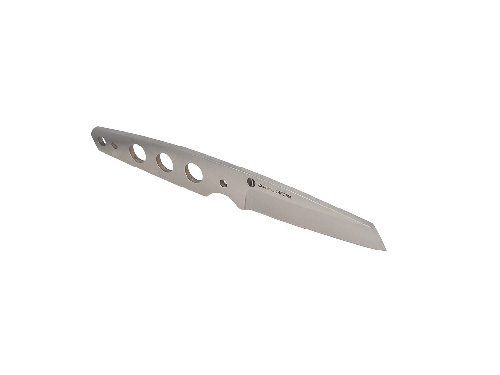 Separate Klinge zur Herstellung eines 4 mm dicken Messers aus Sandvik 14C28N Edelstahl. Die Klinge hat ein Full-Tang-Design. Die Gesamtlänge beträgt 19 cm, die Länge der Klinge selbst beträgt 8 cm. Die Breite der Klinge beträgt 2,9 cm, die Durchmesser der Löcher im Griff betragen 2 x 4,6 cm und 1 x 6,3 mm. Die Klinge hat einen Flachschliff. Lochabmessungen: Corby: 2 x 4,6 mm, Lanyard: 6,3 mm
