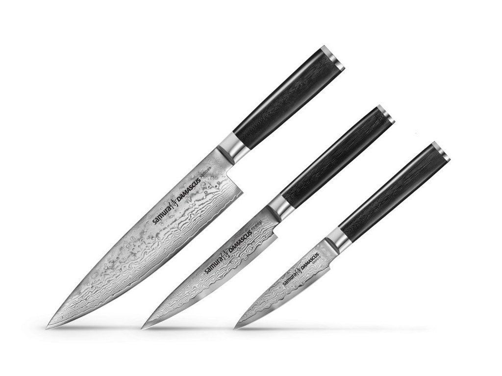 Dieses professionelle Samura Damascus Küchenmesser-Set enthält drei der am häufigsten verwendeten Arten von Küchenmessern. Die Samura Damascus Küchenmesser sind wahre Schätze unter den Küchenmessern. Sie bieten eine Kombination aus einer dünnen und extrem scharfen Klinge aus japanischem Damaststahl (67 Schichten Stahl, Härte bis zu 61 HRC) und einem stabilen, runden Griff aus G10-Material. Die Messer sind gut ausbalanciert, von höchster Qualität und haben ein faszinierendes minimalistisches Design. Sie werden in einer schönen Box geliefert, wodurch sie auch als Geschenk geeignet sind.