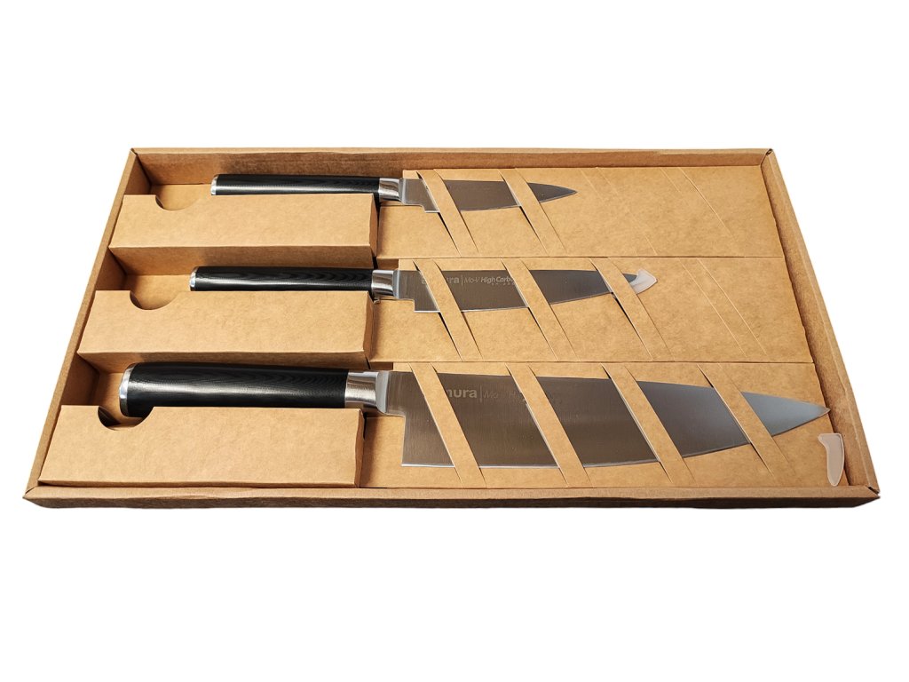 Samura ist ein moderner Hersteller japanischer Küchenmesser, der in der Vergangenheit Messer in Zusammenarbeit mit der Marke Mcusta hergestellt hat. Die Küchenmesser von Samura sind eine Kombination aus japanischen und europäischen Küchenmessern. Im Gegensatz zu traditionellen japanischen Messern sind Samura-Messer aus rostfreiem Stahl gefertigt und weniger brüchig, wodurch die Gefahr des Ausbrechens der Klinge eliminiert wird. Gleichzeitig behalten sie jedoch die hervorragenden Schneideigenschaften, die für japanische Messer typisch sind.