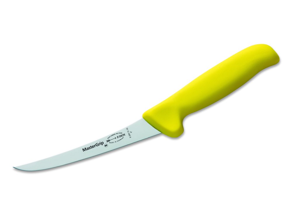 Dick MasterGrip professionelles Metzgermesser mit einer soliden, stark gebogenen 15 cm langen Klinge ist ein mittelgroßes Messer, das für die Fleischverarbeitung verwendet wird. Die Klinge des Messers besteht aus dem hochlegierten, rostfreien deutschen Stahl X55CrMo14, der sich aufgrund seiner Eigenschaften bei der Herstellung von Küchenmessern großer Beliebtheit erfreut. Dieser Stahl ist sehr zäh und korrosionsbeständig. Wenn Sie sich nicht zu oft mit der Messerpflege befassen möchten, ist dies eine ausgezeichnete Wahl für Sie, da es leicht zu schärfen ist. Der Vollkunststoffgriff in Gelb ist an die Form und unterschiedliche Größe der Hände angepasst, sodass das Messer den ganzen Arbeitstag über sicher und komfortabel verwendet werden kann. Dank des hochwertigen Kunststoffs verrutscht das Messer nicht, was für Präzision und gleichzeitig höhere Effizienz sorgt