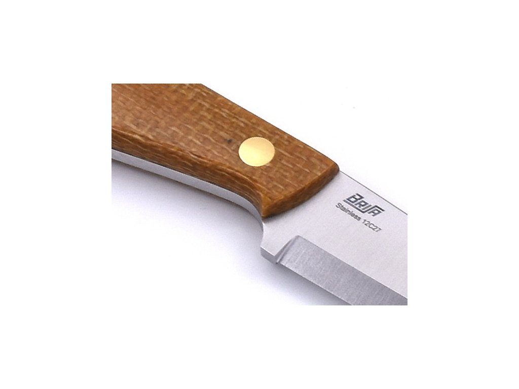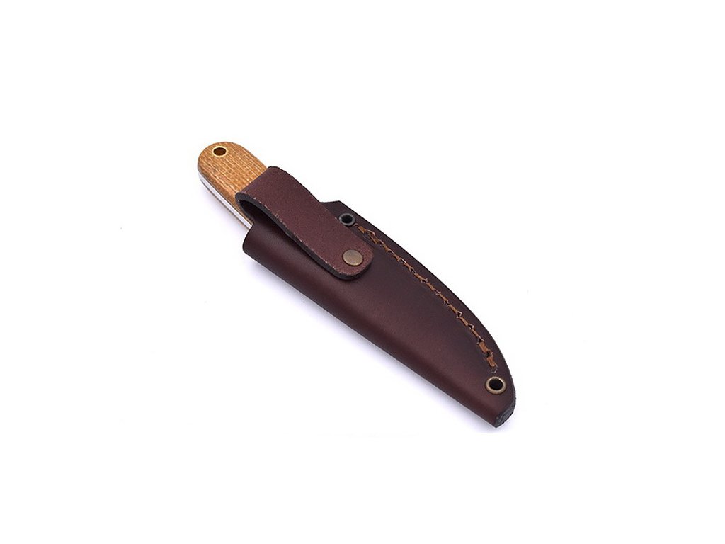 Brisa Necker ist ein Messer mit feststehender Klinge, das um den Hals getragen werden kann. Die Klinge ist 7 cm lang und besteht aus rostfreiem Sandvik 12C27-Stahl mit skandinavischem Schliff. Griff aus senffarbenem Micarta. Die Lederscheide besteht aus hochwertigem spanischem Rindsleder mit sehr starken Nähten.