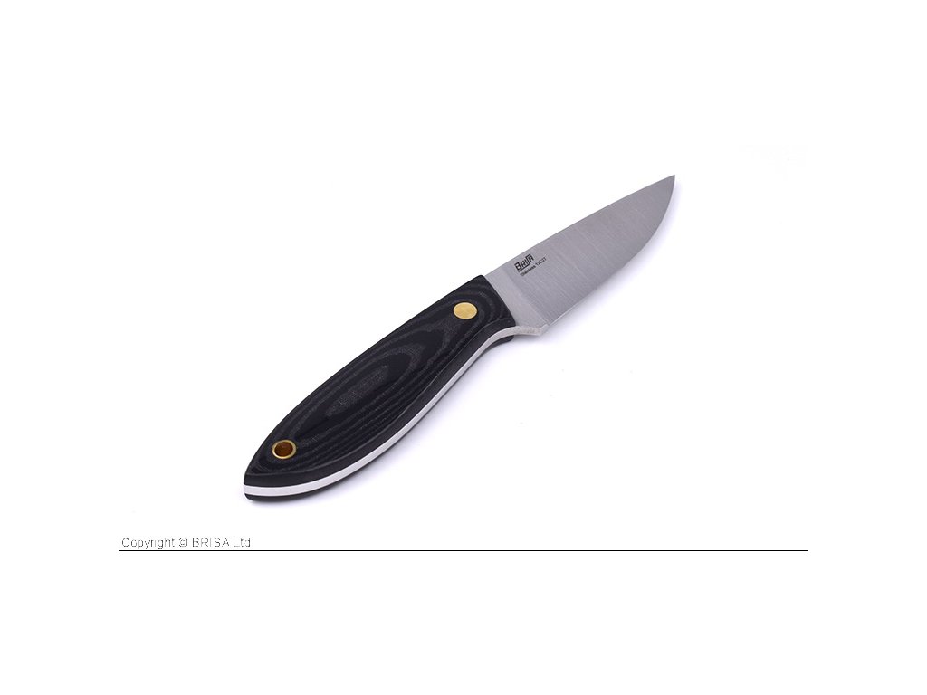 Das Brisa Bobtail ist ein kleineres Messer mit feststehender Klinge, das zum Wandern, Reisen, für den gelegentlichen Transport oder zur Verarbeitung kleinerer Fänge geeignet ist. Klinge 8 cm lang, aus rostfreiem Sandvik 12C27-Stahl mit flachem Schliff. Griff aus schwarzem Micarta, Scheide aus Kydex.