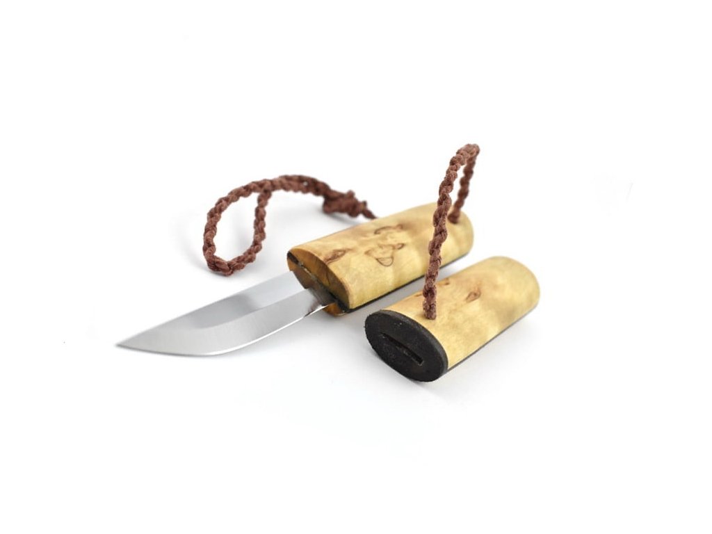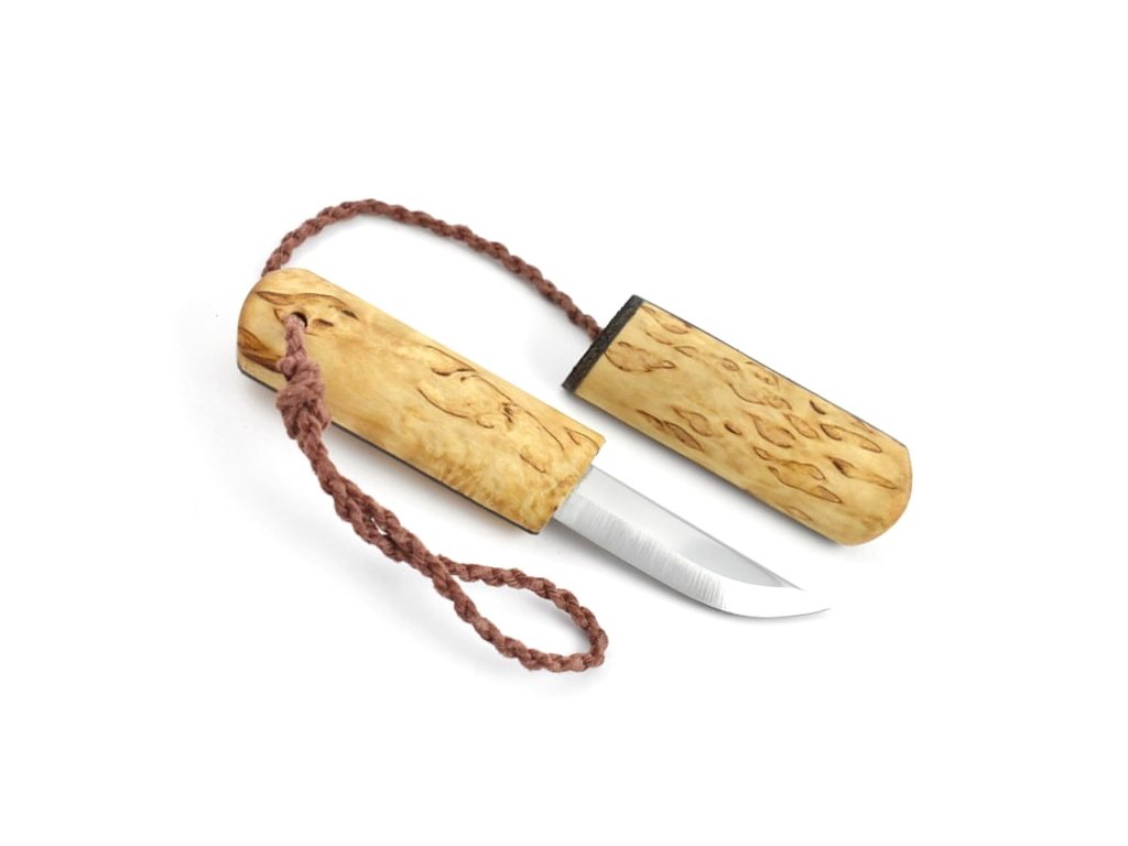Traditionelles kleines nordisches Messer (Puukko), geeignet für feines Schneiden, Holzschnitzen oder sogar für alltägliche kleine Arbeiten. Sowohl der Griff als auch die Scheide des Messers bestehen aus Maserbirkenholz. Klingenlänge 5,5 cm aus rostfreier Stahl.