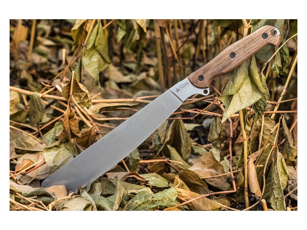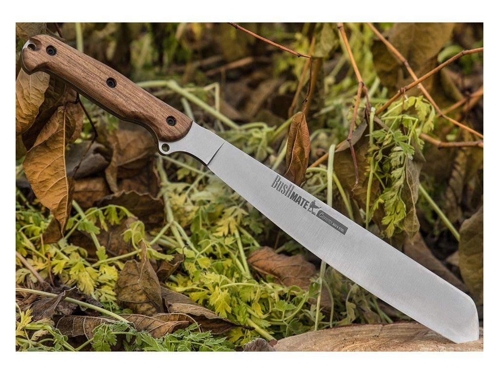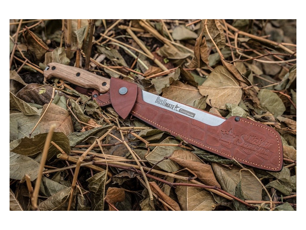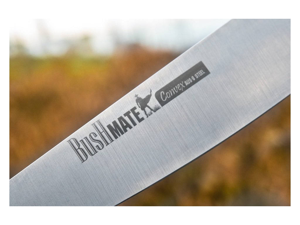 Bushmate ist ein großes Messer, das hauptsächlich zum Hacken gedacht ist. Es basiert auf der Form der Machete der australischen Armee. Die Full-Tang-Konstruktion sorgt für Robustheit und Zuverlässigkeit, und dank der massiven Klinge meistert es auch schwere Aufgaben. Die Klinge mit konvexem Schliff besteht aus rostfreiem Stahl AUS-8, Härte 57-59 HRC mit feiner Stonewash-Oberflächenbehandlung und erreicht eine Stärke von 4,8 mm. Griff aus kaukasischem Walnussholz. Das Messer wird mit einer Lederscheide geliefert.