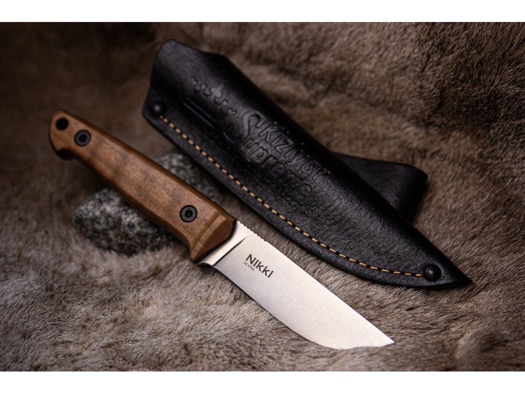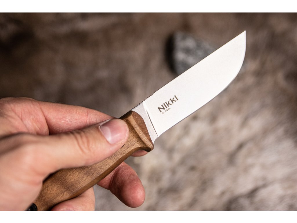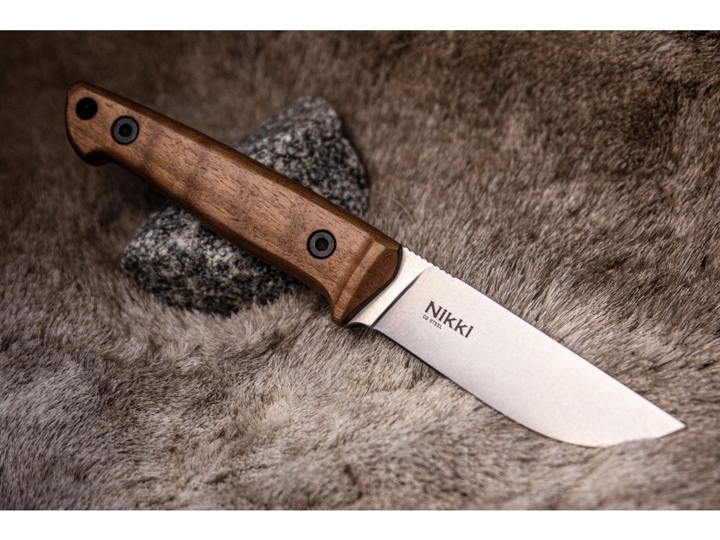 Nikki ist ein kleineres Outdoormesser. Die Full-Tang-Konstruktion gewährleistet Stärke und Zuverlässigkeit. Klinge aus Werkzeugstahl D2, Härte 60-62 HRC mit Stonewash-Oberflächenveredelung und Hohlschliff. Griff aus kaukasischem Walnussholz. Das Messer wird mit einer Lederscheide geliefert.