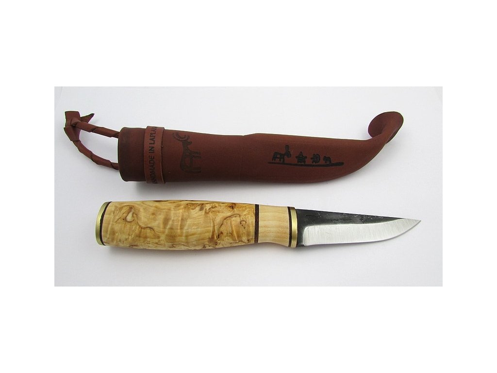 Traditionelles nordisches Messer (Puukko), geeignet für alle gängigen Aktivitäten in der Natur, bei der Jagd oder auch für den täglichen Gebrauch. Griff aus einer Kombination aus Birkenholz (Maser- und gewöhnliche Birke) mit einer Messingbacke. Klingenlänge 8 cm aus Kohlenstoffstahl. Zum Messer gehört eine hochwertige Lederscheide, das am Gürtel befestigt werden kann. Kohlenstoffstahl hält die Schärfe gut und lässt sich leicht nachschärfen, ist jedoch anfälliger für Rost (das Messer muss nach Gebrauch gründlich gereinigt und getrocknet werden, außerdem empfiehlt es sich, die Klinge von Zeit zu Zeit mit Öl einzureiben).