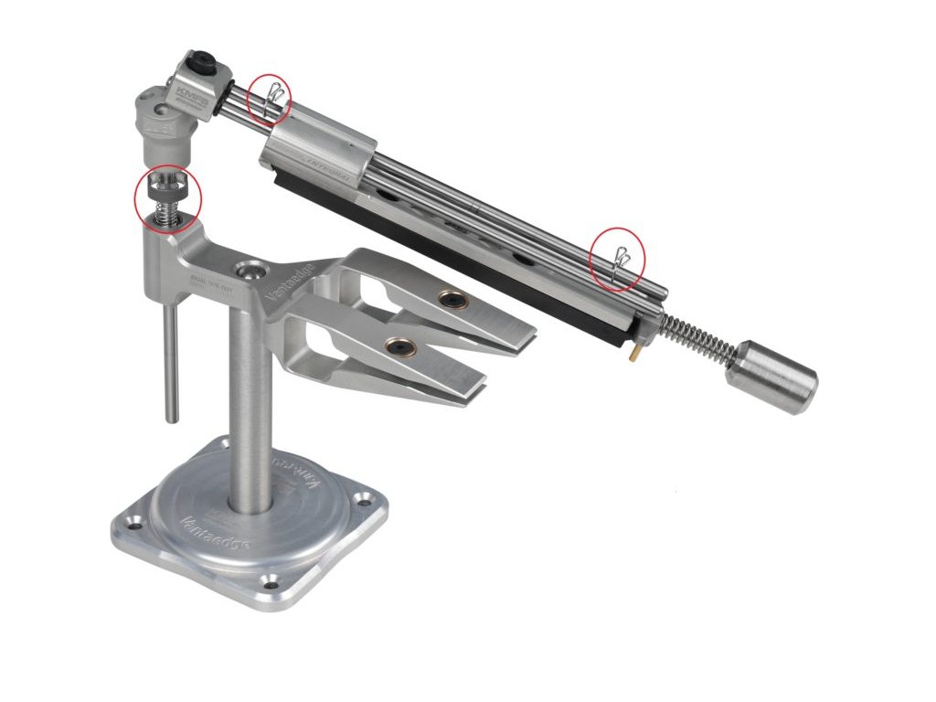 Die Anschläge werden auf die Führungsstange des Steinhalters aufgesetzt und dienen als Begrenzung für die obere Position, um bei breiten Klingen ein Abrutschen des Steins von der Facette auf die Messerseite zu verhindern, sowie für die untere Position, um ein Herausrutschen des Halters aus den Führungsstangen zu vermeiden.