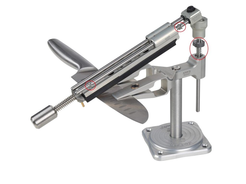 Das Gehäuse des Federhalters ist so geformt, dass es selbsthemmend ist und somit nach dem Aufschieben auf die Stange in der eingestellten Position verbleibt. Die eingestellte Position hebt durch das Zusammendrücken der Feder den Kopf und das damit verbundene Gewicht des Schleifsteinhalters, der Führungsstangen und des Schleifsteins an. Die Feder muss den Stein nicht vollständig über der Klinge halten; es reicht aus, wenn sie teilweise zusammengedrückt ist.