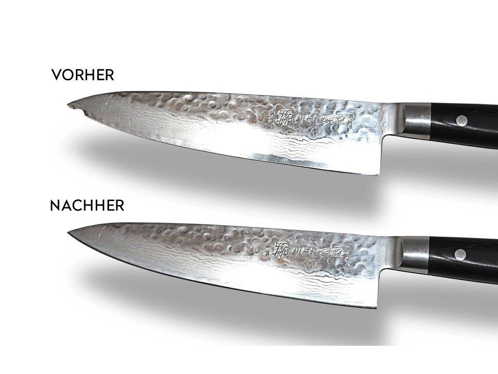 Wir schärfen nicht nur klassische Küchenmesser, sondern auch Brotmesser, Einseitige Messer, Jagdmesser, Taschenmesser und Scheren (einschließlich Friseurscheren und Stoffscheren). Bitte beachten Sie, dass es sich hierbei um feine Handarbeit handelt, welche sehr aufwendig ist. Somit kann dies zwischen 1-2 Wochen dauern.