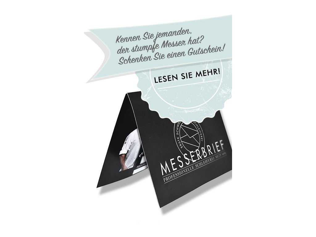 Wie funktioniert das? Nach dem Kauf erhalten Sie einen Geschenkgutschein in Papierform, den Sie verschenken können. Jeder Gutschein enthält einen einzigartigen Code. Nach Eingabe dieses Codes erhält die beschenkte Person automatisch einen Rabatt in entsprechender Höhe. Alle unsere Schleif-Gutscheine können Sie selbst (oder der Beschenkte) unter www.messerbrief.de beim Bestellvorgang eingeben.