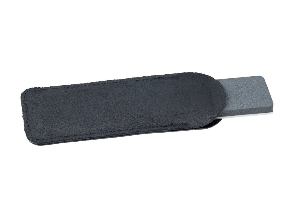 Keramik-Schleifstein im Taschenformat, zum Notschleifen in der Natur. Zwei verschiedene Körnungen: weißer Stein – Körnung 9 Mikron und dunkler Stein aus synthetischen Saphiren – Körnung 15 Mikron. Das Lederetui kann zum Abdecken der Klinge nach dem Schärfen (mit oder ohne Schleifpaste) verwendet werden.