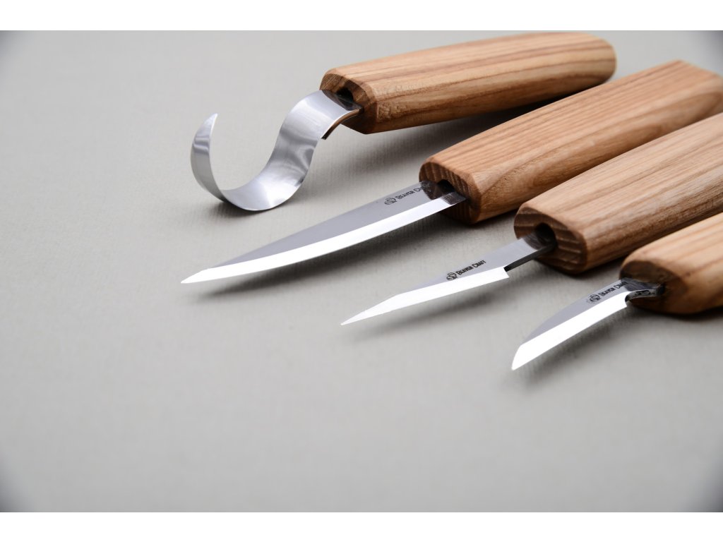 Spezielle Schnitzmesser, Löffelmesser (Hakenmesser) und Hohleisen in verschiedenen Formen und Größen, geeignet für verschiedene Schnitztechniken. Für die Herstellung von Schnitzwerkzeugen verwendet BeaverCraft einen speziell legierten Kohlenstoffstahl mit Mangananteil und einer Härte von 57 – 59 HRC. Es handelt sich um einen Federstahl, er lässt sich gut schleifen und man kann damit problemlos eine hohe Schärfe erzielen. Dieser Stahl hält starkem Verdrehen und Biegen stand, ohne sich zu verformen. Alle Werkzeuge von BeaverCraft werden am Ende der Produktion einer Qualitätskontrolle unterzogen. Der Hersteller prüft sorgfältig Form, Schärfe, Härte, Geometrie und Aussehen der Werkzeuge.